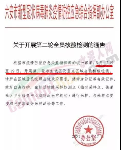17日六安市發(fā)布《關于第二輪全員核酸檢測的通告》