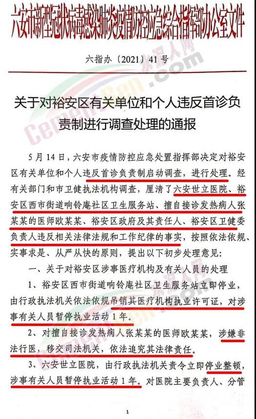 5月16日,安徽六安裕安區(qū)有關單位和個人因違反首診負責制,多人被問責,其中包括:對擅自接診發(fā)熱病人張某某的醫(yī)師歐某某,涉嫌非法行醫(yī),移交司法機關,依法追究其法律責任;責成裕安區(qū)對區(qū)衛(wèi)健委主要負責人、分管負責人,立即停職,接受進一步調(diào)查處理等。