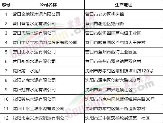 遼寧營口、沈陽兩市水泥企業(yè)名單