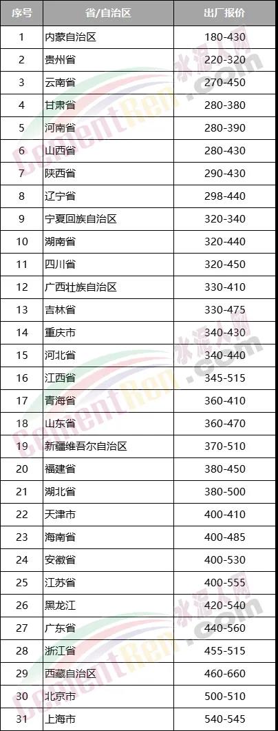 截止目前,水泥報(bào)價(jià)仍處于300元/噸以下的企業(yè)分布在甘肅省平?jīng)鍪?、貴州省安順市、貴陽市、六盤水市、黔東南苗族侗族自治州、黔南布依族苗族自治州、黔西南布依族苗族自治州;內(nèi)蒙古自治區(qū)阿拉善盟、巴彥淖爾市、包頭市、鄂爾多斯市、呼和浩特市、烏海市、烏蘭察布市;山西省呂梁市、朔州市、忻州市以及陜西省榆林市、云南省昆明市、河南省焦作市;遼寧省朝陽市等20多個(gè)地區(qū)。