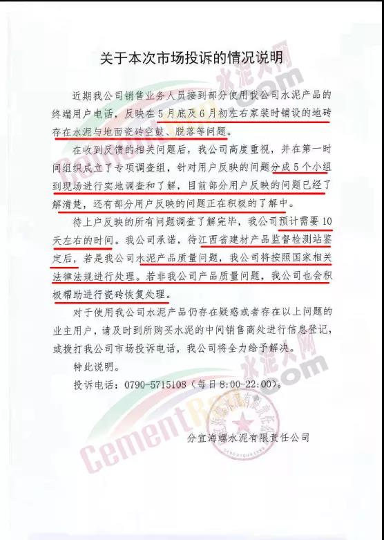 公司承諾:待江西省建材產(chǎn)品監(jiān)督檢測站鑒定后,若是分宜海螺水泥產(chǎn)品質(zhì)量問題,企業(yè)將按照國家相關(guān)法律法規(guī)進行處理;若非企業(yè)產(chǎn)品質(zhì)量問題,分宜海螺也會積極幫助進行瓷磚恢復(fù)處理。