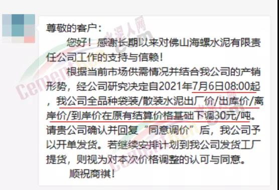 水泥人網(wǎng)信息中心消息,日前廣東省佛山海螺水泥通知:自2021年7月6日8時起,全品種袋裝/散裝水泥出廠價/出庫價/離岸價/到岸價在原有結(jié)算價格基礎(chǔ)下調(diào)30元/噸。
