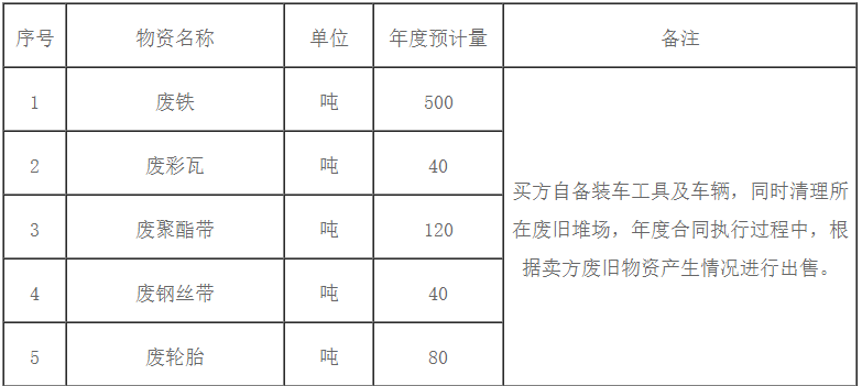 根據(jù)《廢舊物資管理辦法》,為規(guī)范公司廢舊物資出售管理,保證廢舊物資出售過程的公開、公平、公正,興業(yè)海螺計劃對2021-2022年公司內(nèi)廢舊物資進行公開招標,本次招標主要針對日常產(chǎn)生的廢舊物資以及部分廢鋼球一次性的處置出售,對年度內(nèi)技改項目大批量廢舊物資的集中處置將另行招標,歡迎具備廢舊物資回收條件的公司參加本次招標活動,現(xiàn)將有關(guān)事項公示如下: