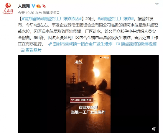 據(jù)人民網(wǎng)官方微博通報(bào),據(jù)登封發(fā)布,20日凌晨4點(diǎn)左右,事發(fā)企業(yè)登電集團(tuán)鋁合金有限公司臨近的潁河水位暴漲并超警戒水位,因河道水位暴漲致圍墻倒塌,廠區(qū)進(jìn)水,該公司立即停電并組織人員安全撤離。6時(shí)許,因洪水漫延到廠區(qū)內(nèi)合金槽內(nèi)高溫溶液發(fā)生爆炸,善后處置工作正在有序進(jìn)行。
