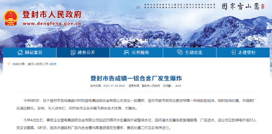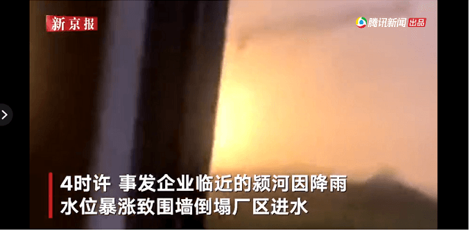 據(jù)登封市人民政府官網(wǎng)通知:當(dāng)日早4點(diǎn)左右,事發(fā)企業(yè)登電集團(tuán)鋁合金有限公司臨近的潁河水位暴漲并超警戒水位,因河道水位暴漲致圍墻倒塌,廠區(qū)進(jìn)水,該公司立即停電并組織人員安全撤離。6時(shí)許,因洪水漫延到廠區(qū)內(nèi)合金槽內(nèi)高溫溶液發(fā)爆炸。