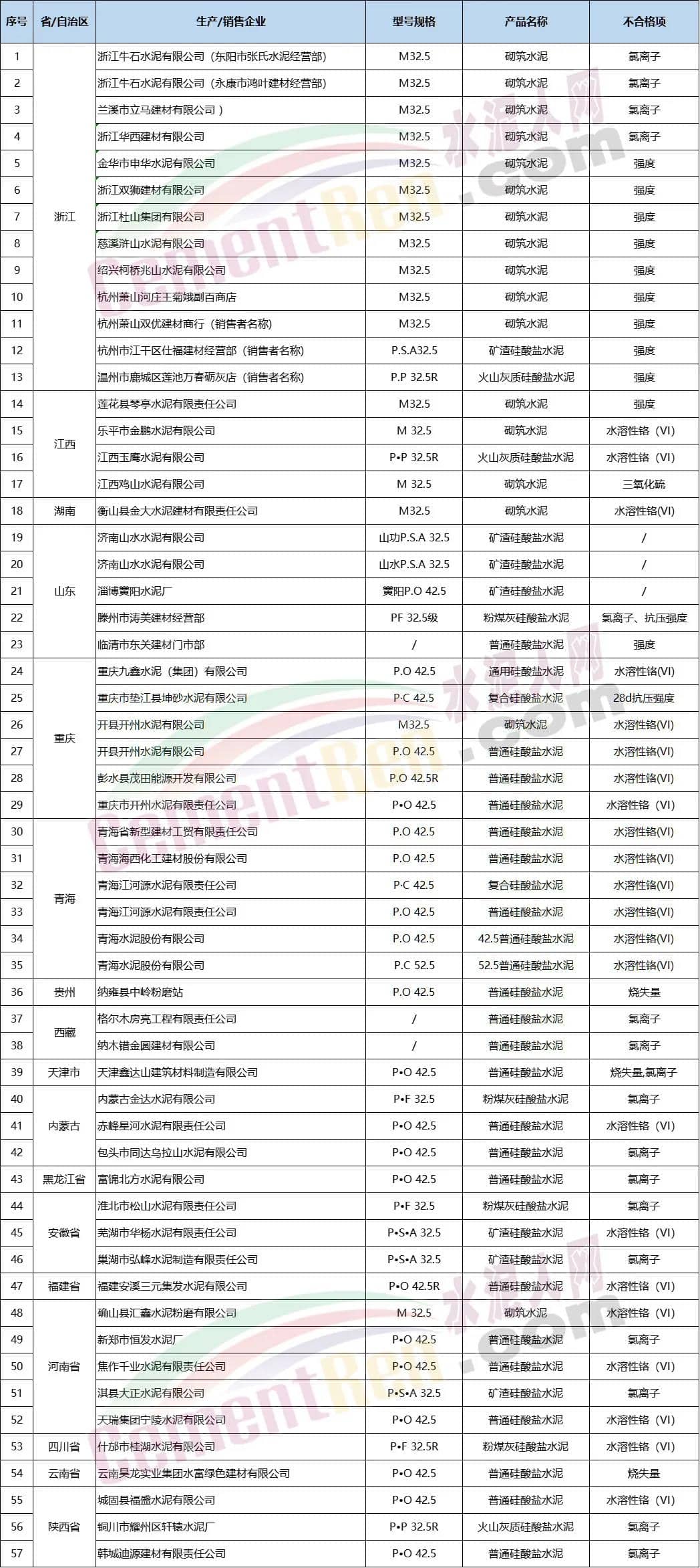 然而,當(dāng)前市場上的水泥質(zhì)量并不樂觀。據(jù)水泥人網(wǎng)不完全統(tǒng)計(jì),僅2021年以來,各地市場監(jiān)管局通報(bào)的水泥質(zhì)量不合格企業(yè)就多達(dá)57家,通報(bào)的不合格水泥不僅包括32.5等級標(biāo)號水泥也包括42.5等級的普通硅酸鹽水泥,不合格項(xiàng)目更是涉及到了抗壓、抗折強(qiáng)度、三氧化硫、氯離子、燒失量、水溶性鉻(Ⅵ)等多個(gè)方面。2021年1月1日至今被各省市自治區(qū)市場監(jiān)管部門通報(bào)不合格水泥生產(chǎn)/銷售企業(yè)名單如下: