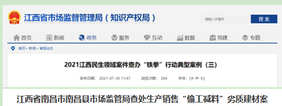 7月30日江西省市場(chǎng)監(jiān)督管理局發(fā)布了2021江西民生領(lǐng)域案件查辦“鐵拳”行動(dòng)典型案例其中提到一起劣質(zhì)建材案。