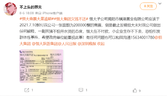 “恒大子公司揭陽市橫港置業(yè)有限公司一張面額20萬的商票到期未付,未給予任何解釋。"