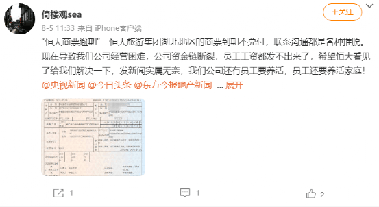 另一網(wǎng)友提到,“河北恒大嚴(yán)重逾期,展期承諾準(zhǔn)時付款,卻仍然延期不付,公司已經(jīng)被拖累好幾個月發(fā)不出工資,瀕臨倒閉。”