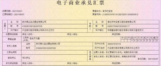 另一持票人爆料,一張出票人為奧山置業(yè)旗下子公司武漢奧山圣達置業(yè)有限公司的商票已于8月6日逾期尚未兌付。收票人為湖北中科宏泰工程機械有限公司,出票日期2021年2月7日,匯票到期日2021年8月7日,持票周期半年。票面金額50萬元。