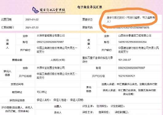 同時,其還曬出了兩份商業(yè)承兌匯票的截圖,金額分別為40多萬和10多萬,出票人均顯示為太原市寶鉅置業(yè)有限公司,出票時間為2021年1月22日,到期日為2021年7月22日。票據(jù)狀態(tài)為“提示付款已拒付”。