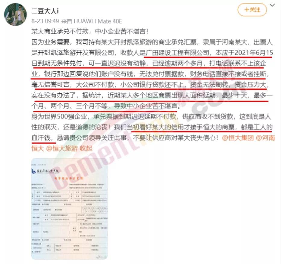 不僅恒大,另一名為“差不多的王sir”發(fā)消息稱“實地地產(chǎn)集團(tuán)開出的商業(yè)承兌匯票到期也開始拒付不予供應(yīng)商付款了。近期有朋友發(fā)來實地地產(chǎn)集團(tuán)的子公司天津金河灣置業(yè)開出的商業(yè)承兌,到期將近一個月時間,竟然還不予解付。不知道是實地地產(chǎn)集團(tuán)近期有變動還是和廣州某大地產(chǎn)一樣資金出現(xiàn)嚴(yán)重問題了。希望實地地產(chǎn)集團(tuán)早日處理解決問題。”