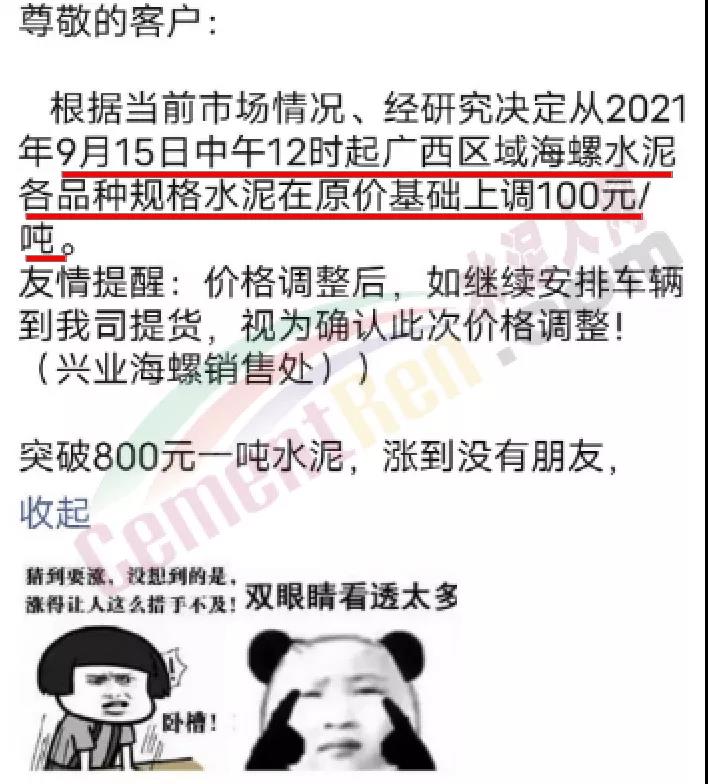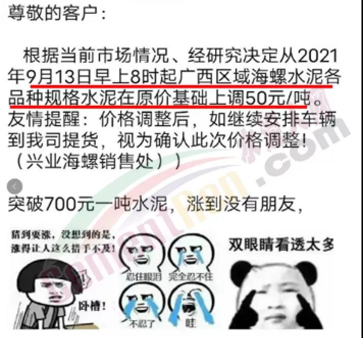 興業(yè)海螺銷售處通知,根據(jù)當(dāng)前市場情況,經(jīng)研究決定從9月15日中午12時(shí)起廣西區(qū)域海螺水泥各品種規(guī)格水泥上調(diào)100元/噸。前一日曾通知自9月13日早8時(shí)起,廣西區(qū)域海螺水泥各品種規(guī)格水泥在原價(jià)基礎(chǔ)上上調(diào)50元/噸。經(jīng)銷商表示,即將漲到800元/噸,漲到?jīng)]朋友了!