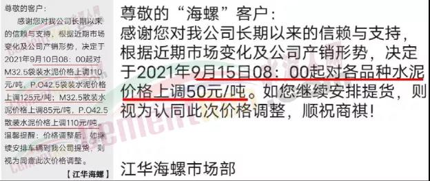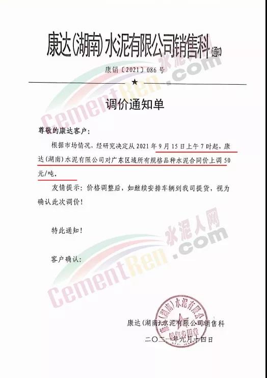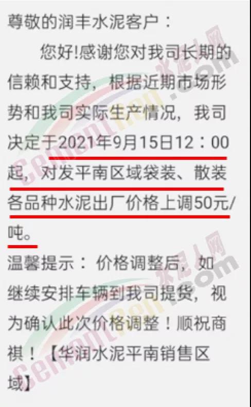 華潤水泥平南銷售區(qū)域通知,根據(jù)近期市場形勢(shì)和公司實(shí)際生產(chǎn)情況,決定于2021年9月15日12時(shí)起,對(duì)發(fā)平南區(qū)域袋裝、散裝各品種水泥出廠價(jià)格上調(diào)50元/噸。