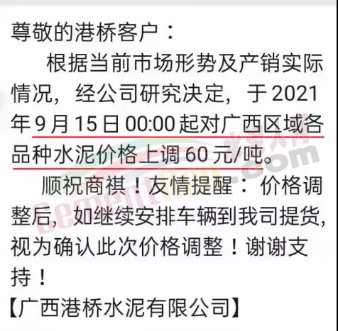 廣西港泥通知,自9月15日起對(duì)廣西區(qū)域各品種水泥上調(diào)60元/噸。