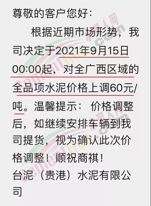 臺(tái)泥(貴港)水泥有限公司通知,自9月15日0時(shí)起,對(duì)全廣西區(qū)域全品項(xiàng)水泥價(jià)格上調(diào)60元/噸。