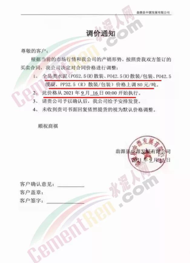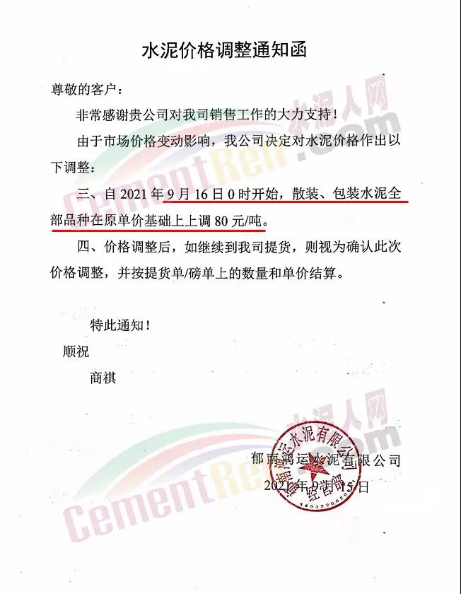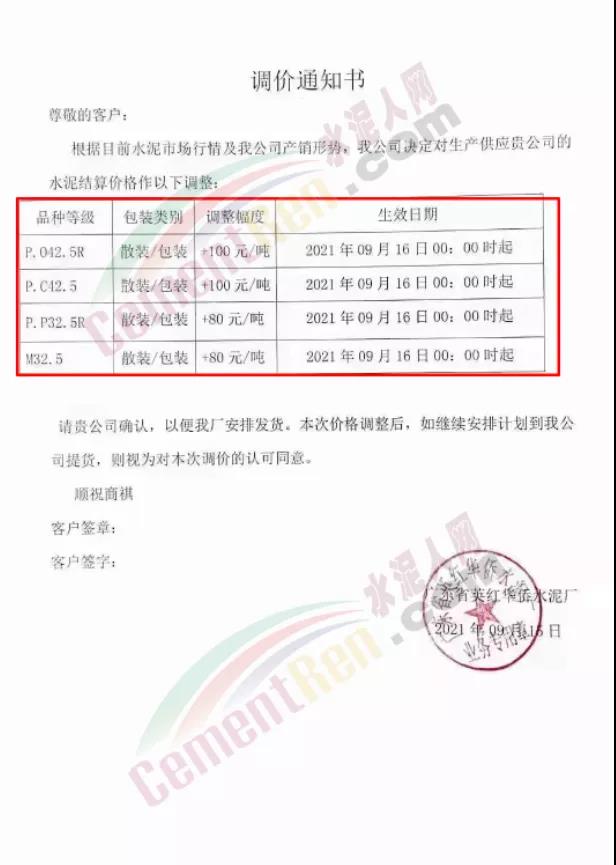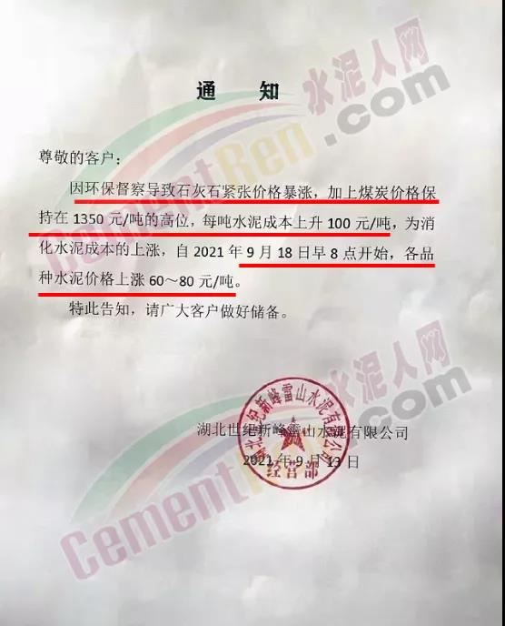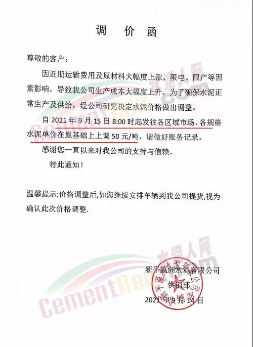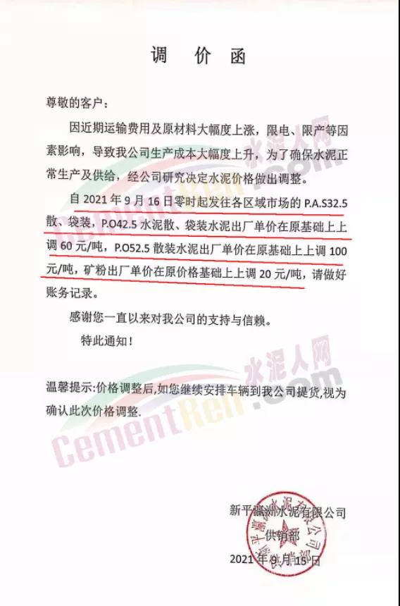 云南省玉溪市新平彝族傣族自治縣新平瀛洲水泥有限公司通知,因近期運(yùn)輸費(fèi)用及原材料大幅度上漲,限電、限產(chǎn)等因素影響,導(dǎo)致公司生產(chǎn)成本大幅度上升,為了確保水泥正常生產(chǎn)及供給,經(jīng)公司研究決定水泥價(jià)格做出調(diào)整。自2021年9月16日零時(shí)起發(fā)往各區(qū)域市場的P.A.S32.5散、袋裝,PO42.5水泥散、袋裝水泥出廠單價(jià)在原基礎(chǔ)上上調(diào)60元/噸,PO52.5散裝水泥出廠單價(jià)在原基礎(chǔ)上上調(diào)100元/噸,礦粉出廠單價(jià)在原價(jià)格基礎(chǔ)上上調(diào)20元/噸。