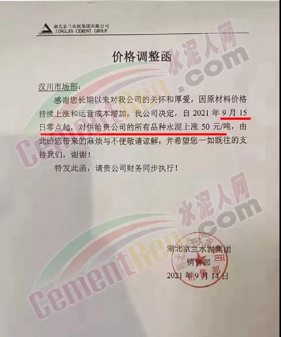 湖北京蘭水泥通知9月15日零時(shí)起,所有品種水泥上漲50元/噸。