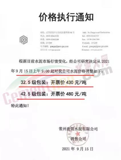 江蘇常州盤固水泥有限公司銷售公司通知,9月15日上午9時(shí)對(duì)公司水泥價(jià)格進(jìn)行調(diào)整,調(diào)整后42.5包裝開票價(jià)480元/噸。