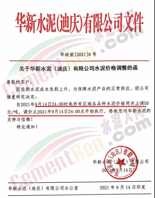 華新水泥(迪慶)有限公司通知,9月14日24時(shí)所有區(qū)域各品種水泥價(jià)格同步上調(diào)50元/噸。