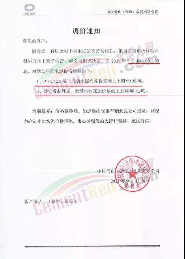 中材天山(云浮)水泥有限公司通知9月16日0時(shí)起P.C42.5級(jí)水泥上調(diào)90元/噸,其他各品牌水泥上調(diào)80元/噸。