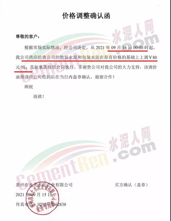 惠州光大水泥通知,9月16日0時(shí)起,水泥價(jià)格上調(diào)80元/噸。