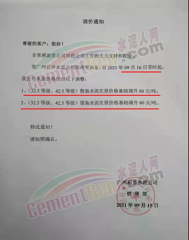 廣州石井水泥公司通知,9月16日0時(shí)起,各標(biāo)號(hào)水泥上調(diào)80元/噸。