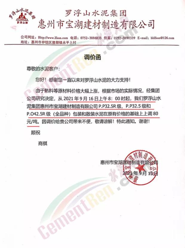 博羅縣園洲羅浮山水泥有限公司通知,9月16日上午8時(shí)起各標(biāo)號(hào)水泥上調(diào)80元/噸。