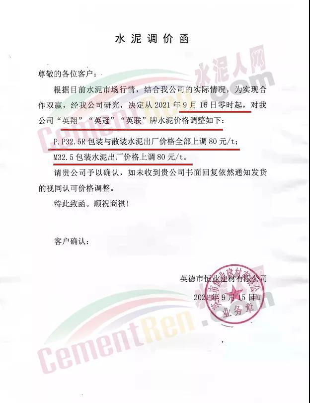 英德市恒業(yè)建材有限公司通知9月16日零時(shí)起,公司各標(biāo)號(hào)水泥上調(diào)80元/噸。