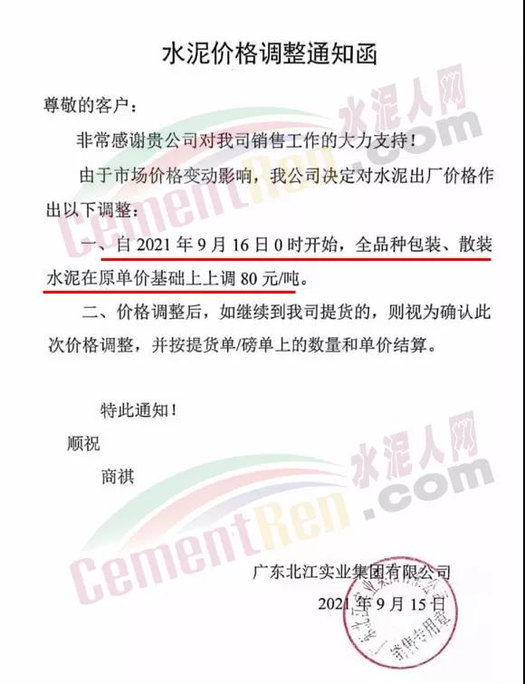 廣東北江實(shí)業(yè)集團(tuán)有限公司通知9月16日0時(shí)開始,全品種水泥上調(diào)80元/噸。