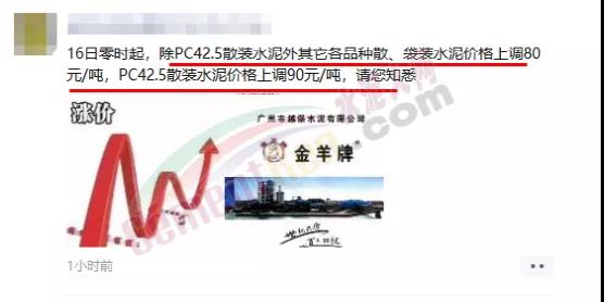 廣州市番禺水泥廠通知自9月16日起各標(biāo)號(hào)水泥上調(diào)80元/噸。
