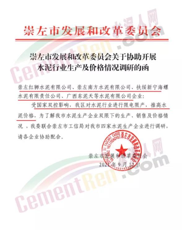 近日,崇左市發(fā)改委發(fā)調研函給轄區(qū)內紅獅、南方、海螺、東泥天等等水泥企業(yè)稱,受國家雙控影響,廣西壯族自治區(qū)對水泥行業(yè)進行限電限產,推高水泥價格,為了解崇左市水泥企業(yè)雙限下的生產、銷售及價格情況,崇左市發(fā)改委聯(lián)合崇左市工信局將對區(qū)域內四家水泥生產企業(yè)進行調研。