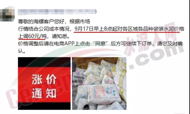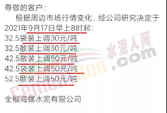 日前,全椒海螺水泥自9月17日早上8時起32.5級水泥上調30元/噸,42.5和52.5等級水泥上調50元/噸。