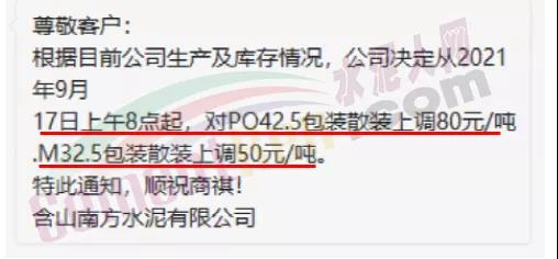 同日,含山南方水泥有限公司通知根據(jù)目前公司生產及庫存情況,公司決定從2021年9月17日上午8點起,對PO42.5包裝散裝上調80元/噸。M32.5包裝散裝上調50元/噸。