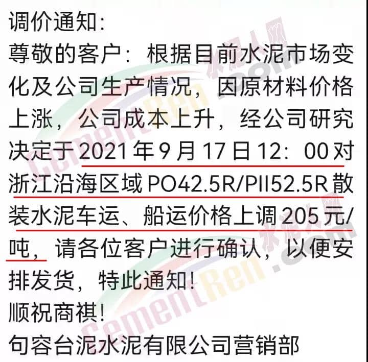 句容臺泥水泥有限公司通知稱,根據(jù)目前水泥市場變化及公司生產情況,因原材料價格上漲,公司成本上升,經公司研究決定于2021年9月17日12時對浙江沿海區(qū)域PO42.5R/PII52.5R散裝水泥車運、船運價格上調205元/噸,創(chuàng)造了近年來單次漲價最高紀錄。
