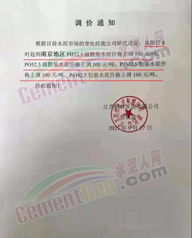 江蘇鶴林水泥有限公司通知,從17日8時起南京地區(qū)各標號水泥上調100元/噸。