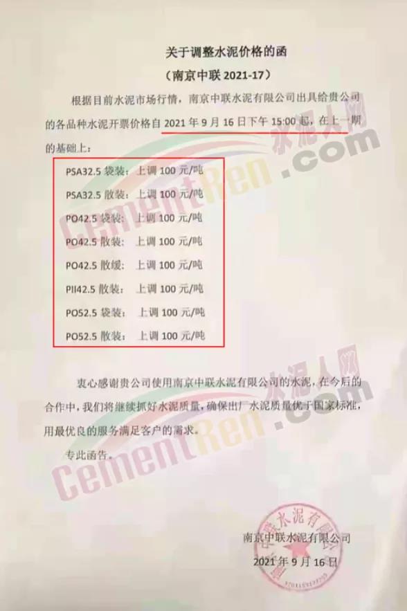 南京中聯(lián)水泥有限公司通知,根據(jù)目前水泥市場行情,自9月16日下午15時起各標號水泥上調100元/噸。