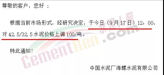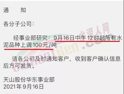 天山股份華東事業(yè)部通知,9月16日中午12時起所有水泥品種上調100元/噸。