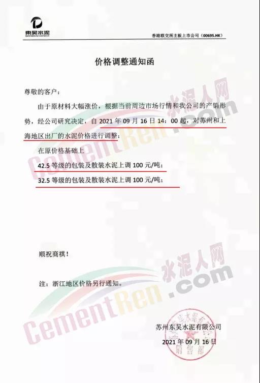 東吳水泥通知,由于原材料大幅漲價,根據(jù)當前周邊市場行情及公司的產銷形勢,自9月16日14時起,對蘇州和上海地區(qū)的出廠水泥價格上調100元/噸。