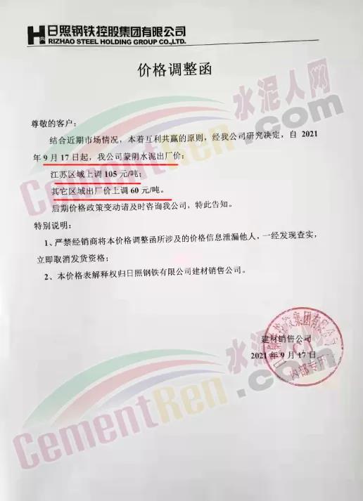 日照鋼鐵控股集團通知,自9月17日起公司蒙陰水泥出廠價,江蘇區(qū)域上調105元/噸,其他區(qū)域出廠價上調60元/噸。