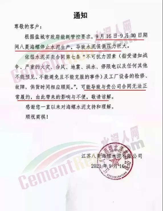 據(jù)水泥人網此前消息,9月16日八菱海螺發(fā)通知稱,根據(jù)江蘇省鹽城市政府能耗管控要求,9月16日-9月30日期間八菱海螺停止水泥生產,導致水泥保供壓力巨大。不可抗力因素可能導致與貴公司合同無法正常履約。