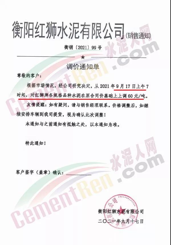 衡陽紅獅水泥通知,自9月17日上午7時起上調各規(guī)格品種水泥價格60元/噸。