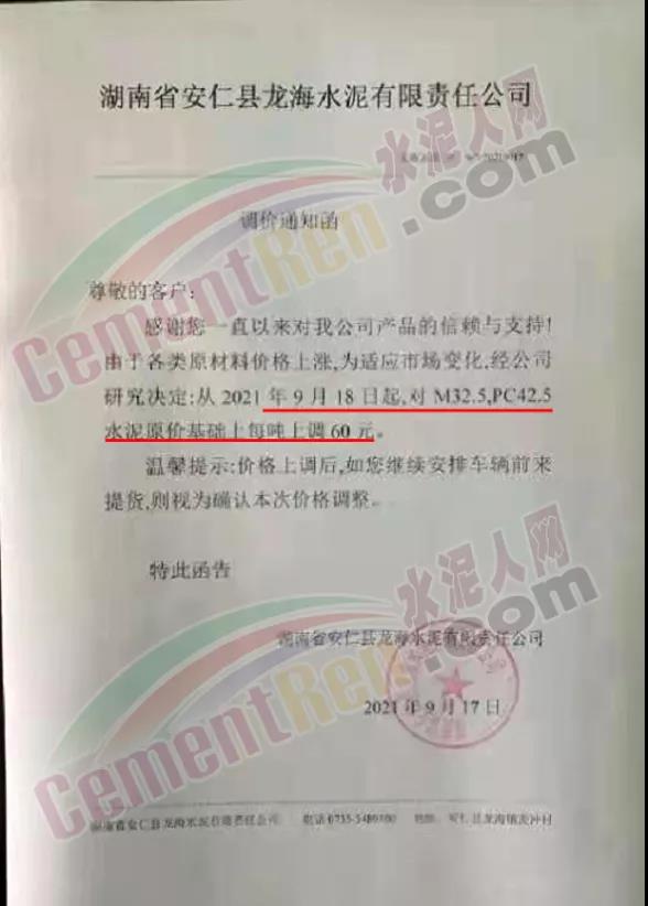 湖南省安仁縣龍海水泥有限責任公司通知,自9月18日起,上調水泥價格60元/噸。
