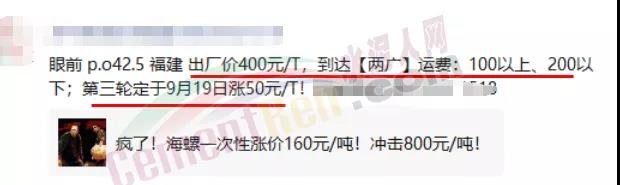 福建地區(qū)經銷商通知稱,目前P.O42.5散裝水泥出廠價400元/噸,到達兩廣運費100-200元以下,并預告稱第三輪漲價定于9月19日漲50元/噸。