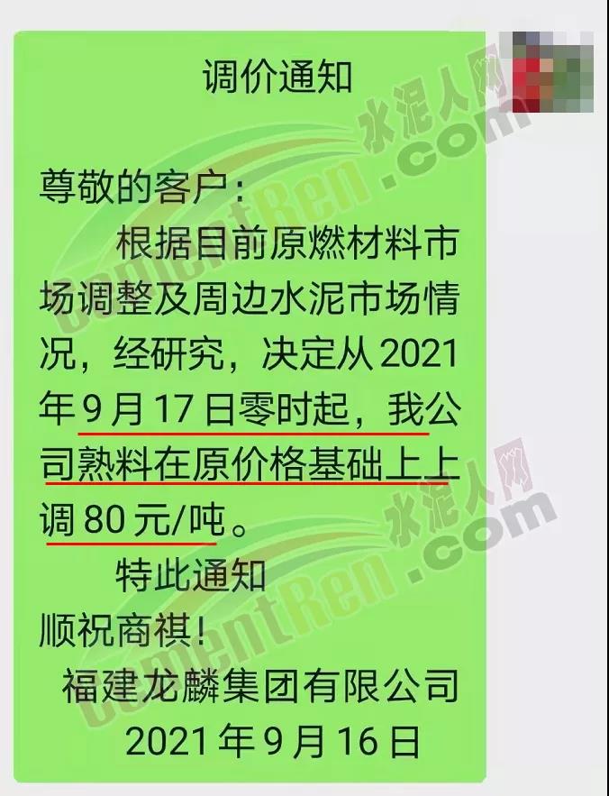 福建龍麟集團通知,9月17日零時起,公司熟料在原價基礎上上調80元/噸。