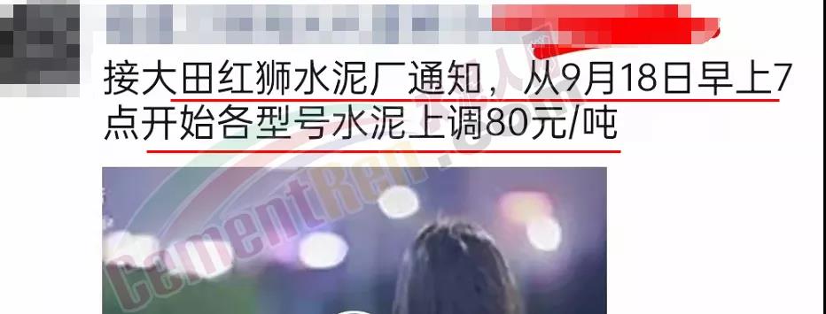 大田紅獅水泥廠通知,從9月18日早上7時起上調各標號水泥價格80元/噸。