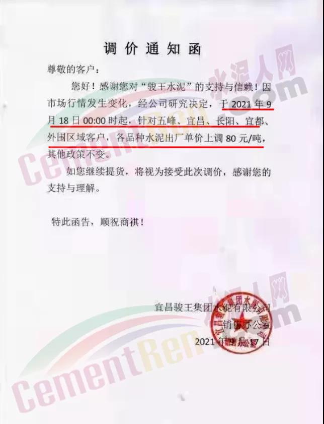 湖北宜昌駿王集團通知9月18日0時起,針對五峰、宜昌、長陽、宜都外圍區(qū)域客戶,各品種水泥出廠單位上調80元/噸。