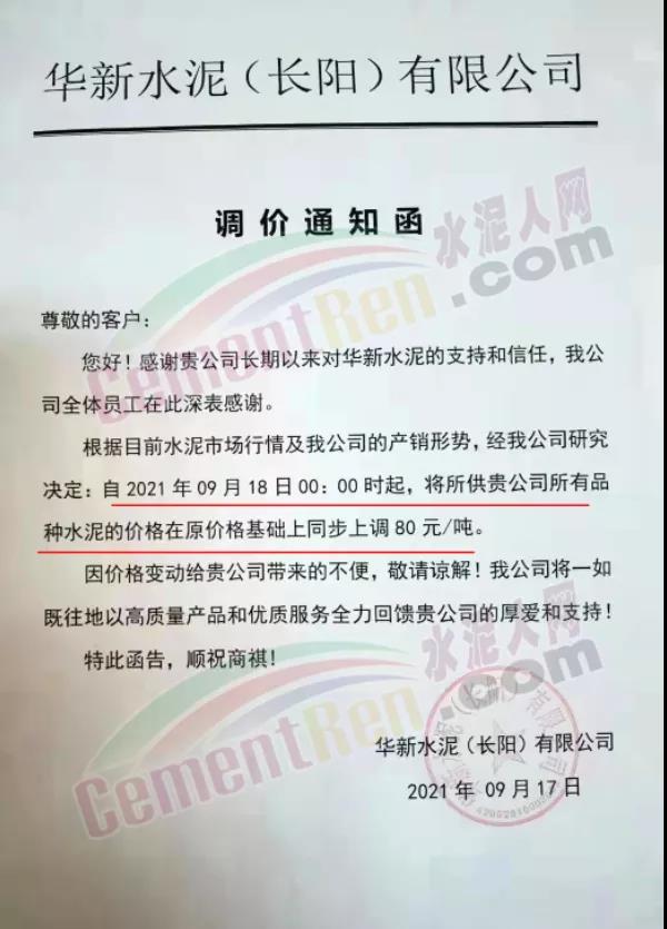 華新水泥(長陽)有限公司9月18日0時起上調各品種水泥價格80元/噸。