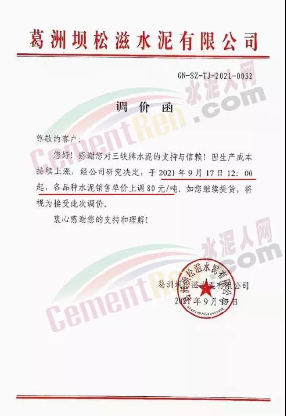 葛洲壩松滋水泥有限公司通知因生產成本持續(xù)上漲,于9月17日12時上調各標號水泥價格80元/噸。