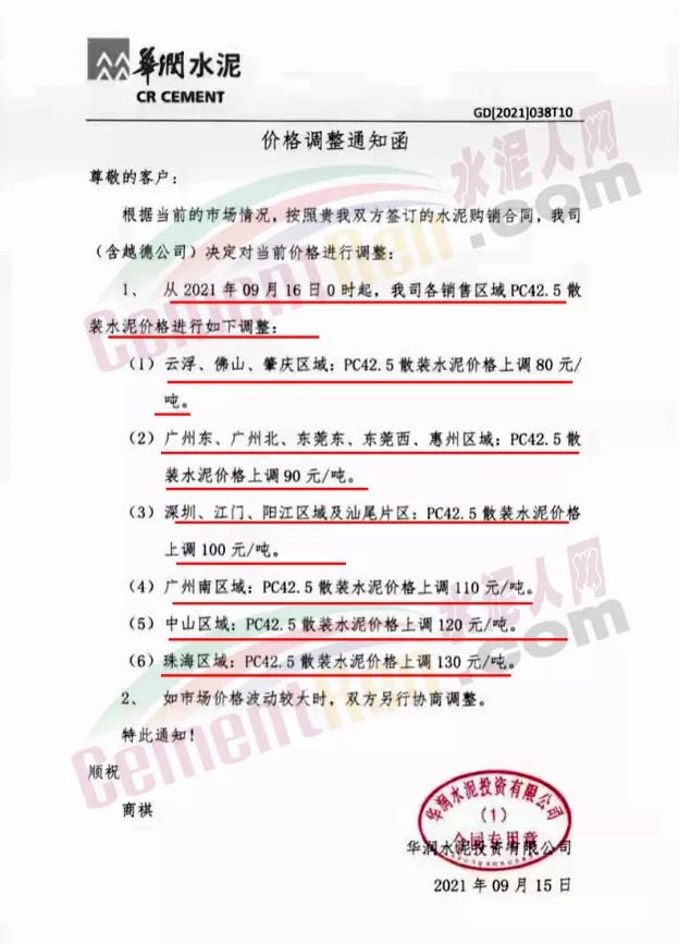 華潤水泥通知根據(jù)當前的市場情況,公司(含越德公司)從2021年9月16日0時起,公司各銷售區(qū)域PC42.5散裝水泥價格進行調整: